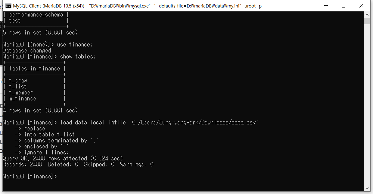 [python] 주식 크롤링 어플 제작기 step.2 마리아DB에 csv파일 넣기