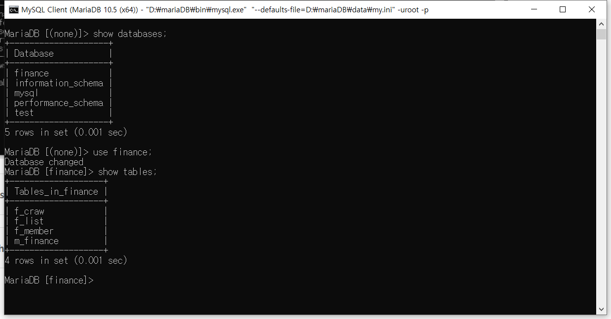 마리아DB 설치시 같이 설치되는 MYSQL CLIENT를 실행시킨다.