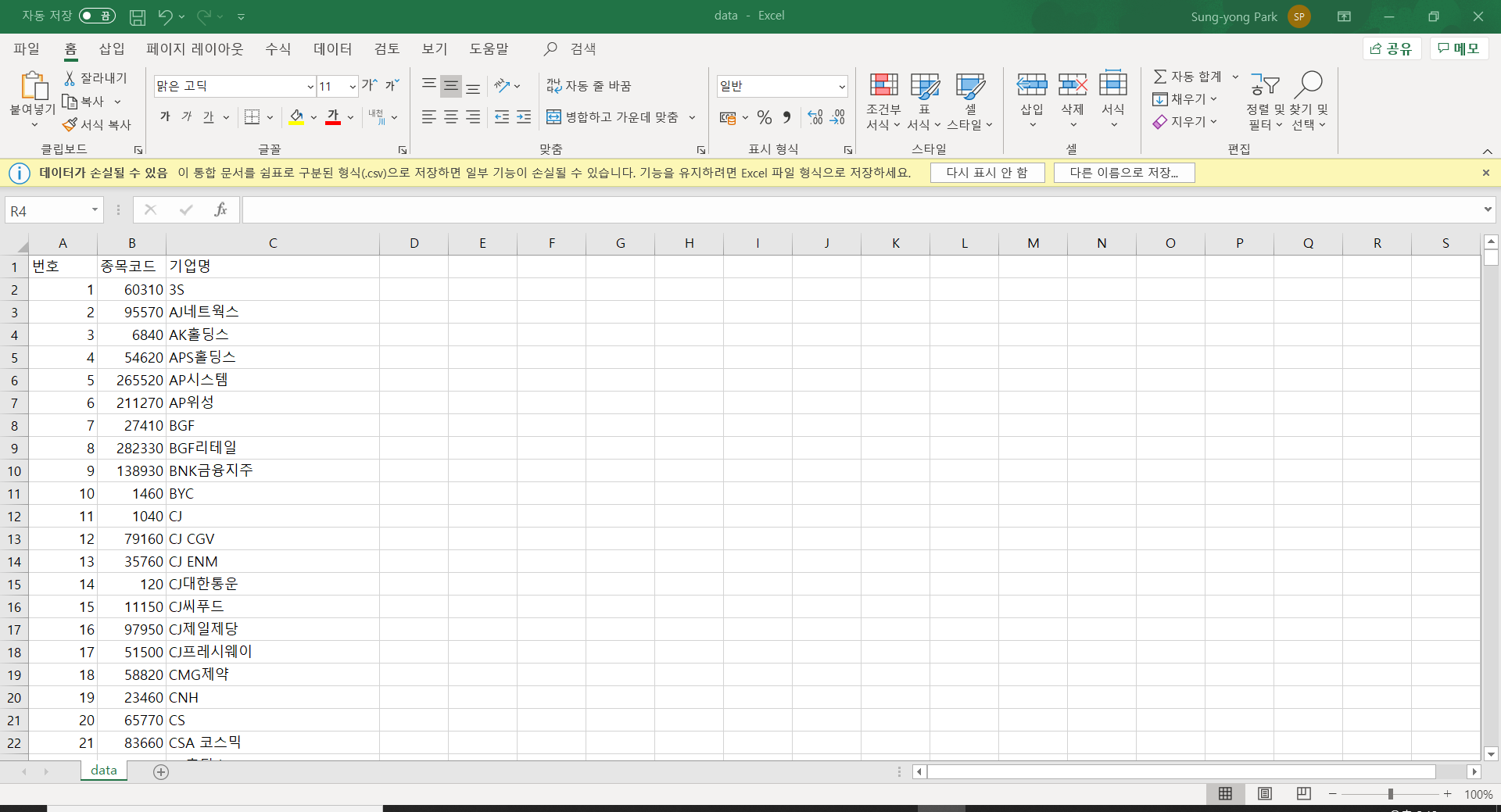 다운 받은 파일에서 필요한 부분(번호, 종목코드, 기업명)을 남기고 모두 삭제했다.